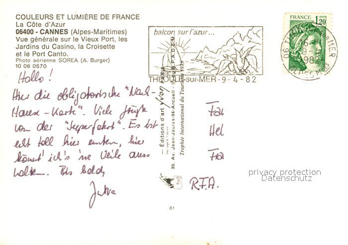 13337385 carte postale Cannes Alpes-Maritimes Vue generale aerienne sur le Vieux Port les Jardins du Casino la Croisette et le Port Canto postalisch gelaufen Erhaltung siehe scans [WerneD78] KatCode: 11170006106029