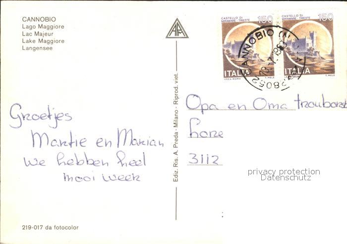 old postcard Cannobio Lago Maggiore Uferstrasse Terrasse Hafen Kirche postalisch gelaufen Erhaltung siehe scans