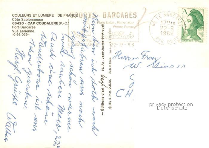13650185 Cap Coudalere Port Barcarès vue aérienne postalisch gelaufen Erhaltung siehe scans [FriedD77] carte postale Frie Katcode 11170066266017