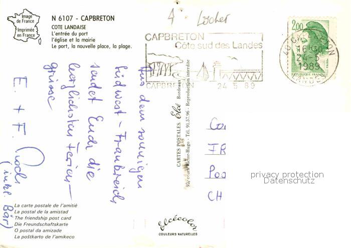 12736964 carte postale Capbreton Entree du port Eglise Mairie Nouvelle Place Plage postalisch gelaufen Erhaltung siehe scans [FriedD77] KatCode: 11170040140065