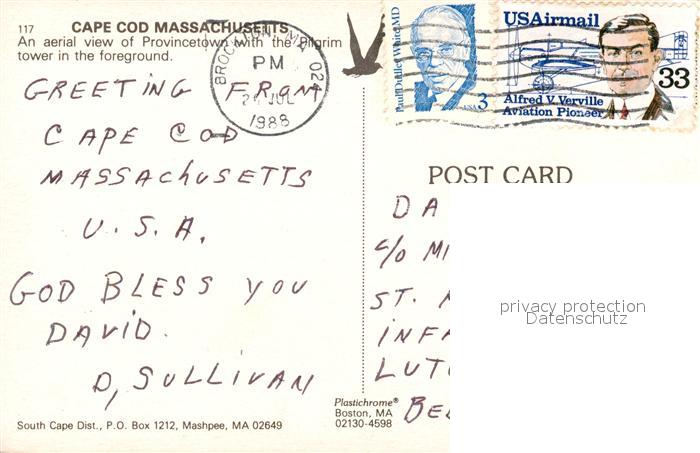 73131602 old postcard Cape Cod Mass. Fliegeraufnahme Pilgrim Tower postalisch gelaufen Erhaltung siehe scans [KathaD81] KatCode: 14140