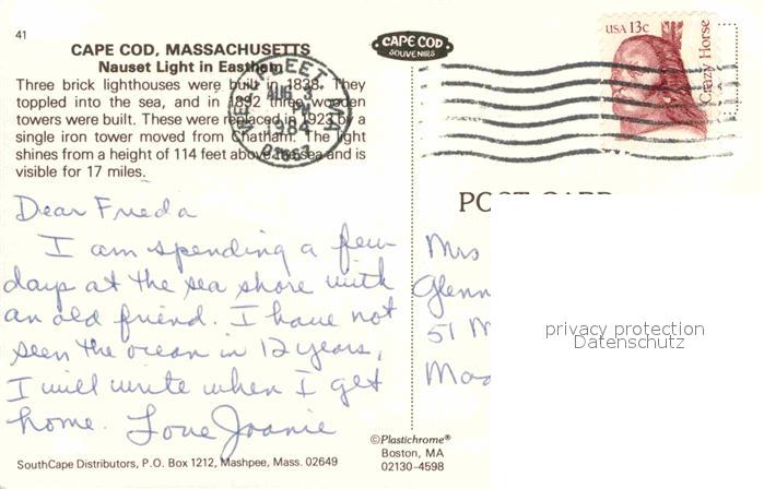 72759498 old postcard Cape Cod Mass. Nauset Light Leuchtturm postalisch gelaufen Erhaltung siehe scans [LiesaD40] KatCode: 14140