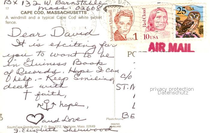 73059034 old postcard Cape Cod Mass. Windmuehle postalisch gelaufen Erhaltung siehe scans [WerneD78] KatCode: 14140
