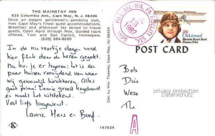 71925858 old postcard Cape May Mainstay Inn postalisch gelaufen Erhaltung siehe scans KatCode: 14140320000000