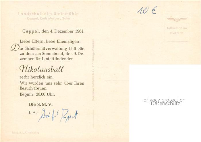73865816 Cappel Marburg Landschulheim Steinmuehle Fliegeraufnahme postalisch nicht gelaufen Erhaltung siehe scans [WerneD78] KatCode: 11110006534014