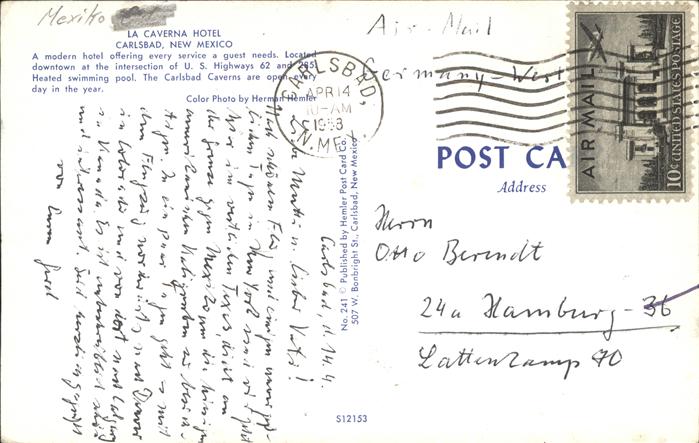 11491781 old postcard Carlsbad New Mexico La Caverna Hotel postalisch gelaufen Erhaltung siehe scans KatCode: 14140330000000
