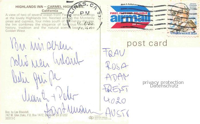 74128728 old postcard Carmel Beach California USA Highlands Inn postalisch gelaufen Erhaltung siehe scans [FriedD77] KatCode: 14140050000000