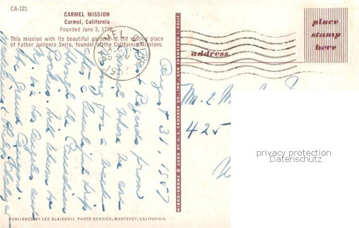 72944256 old postcard Carmel California Carmel Mission postalisch gelaufen Erhaltung siehe scans [WerneD78] KatCode: 14140050000000
