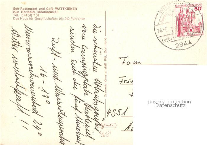 73642271 alte Postkarte Carolinensiel-Harlesiel Ostfriesland See Restaurant Cafe Wattkieker Gastraeume Fliegeraufnahme Fischerhafen postalisch gelaufen Erhaltung siehe scans [WerneD78] KatCode: 11110003462019