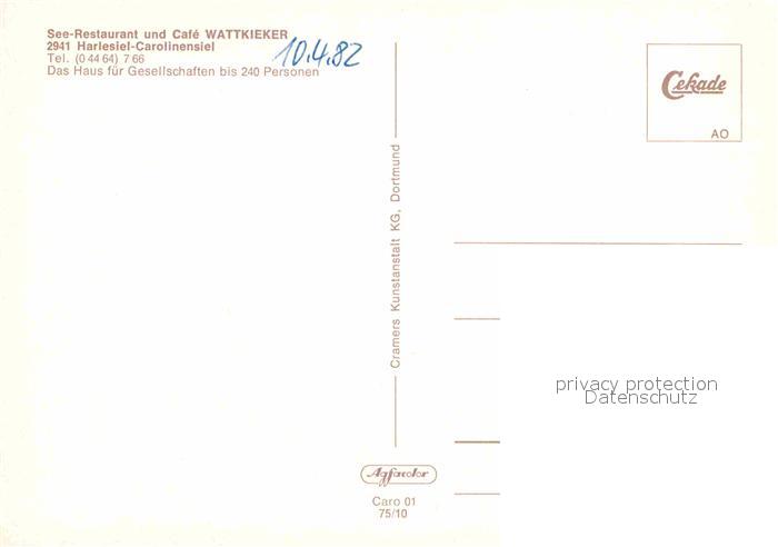 72851073 Carolinensiel-Harlesiel Ostfriesland See-Restaurant Wattkieker Faehre Oldenburg postalisch nicht gelaufen Erhaltung siehe scans [NatalD47] KatCode: 11110003462019