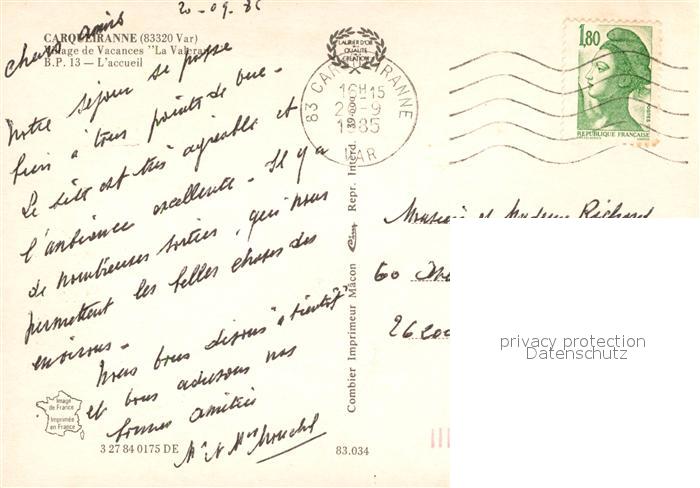 13545958 carte postale Carqueiranne Village de Vacances La Valerane l’accueil postalisch gelaufen Erhaltung siehe scans [WerneD78] KatCode: 11170083283034