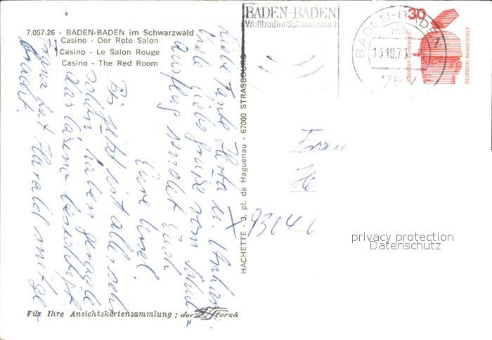 alte Postkarte Casino Spielbank Baden-Baden Roter Salon postalisch gelaufen Erhaltung siehe scans