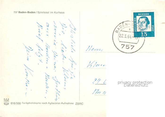 alte Postkarte Casino Spielbank Baden-Baden Spielsaal Kurhaus postalisch gelaufen Erhaltung siehe scans [PaolaD17]