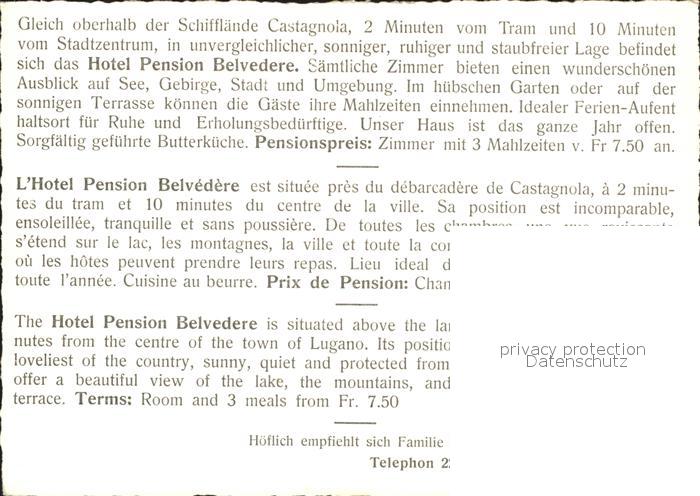 11642467 Castagnola-Cassarate Hotel Pension Belvedere postalisch nicht gelaufen Werbekarte (keine Postkarte) Erhaltung siehe scans KatCode: 11470210665286