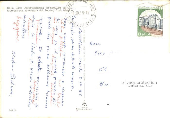 old postcard Castelfranco Veneto Teilansichten Burgruine Turm Strassenkarte postalisch gelaufen Erhaltung siehe scans