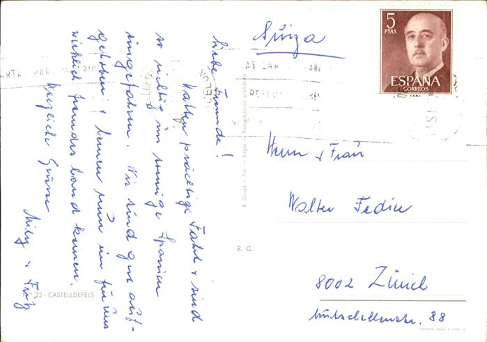 old postcard Castelldefels Vistas parciales Playa Castillo postalisch gelaufen Erhaltung siehe scans