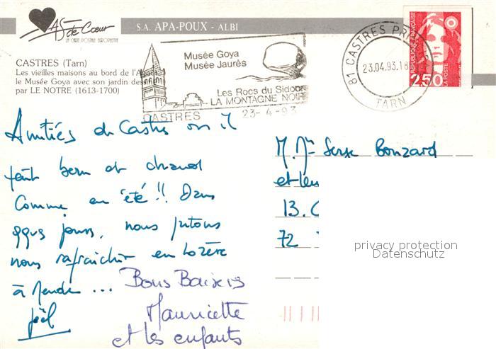 13578333 carte postale Castres Tarn Les vieilles maisons au bord de l’Agout le Musee Goya avec son jardin dessine par Le Notre postalisch gelaufen Erhaltung siehe scans [WerneD78] KatCode: 11170081281065