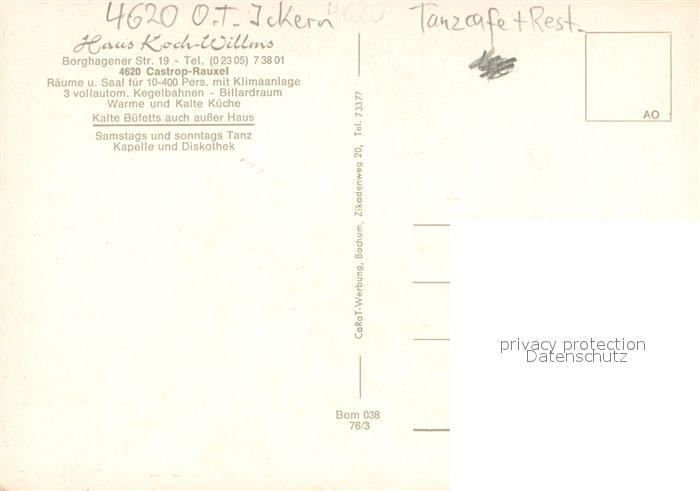 73691833 Castrop-Rauxel Haus Koch Willms Bar Gastraeume Kegelbahn postalisch nicht gelaufen Erhaltung siehe scans [WerneD78] KatCode: 11110005562004