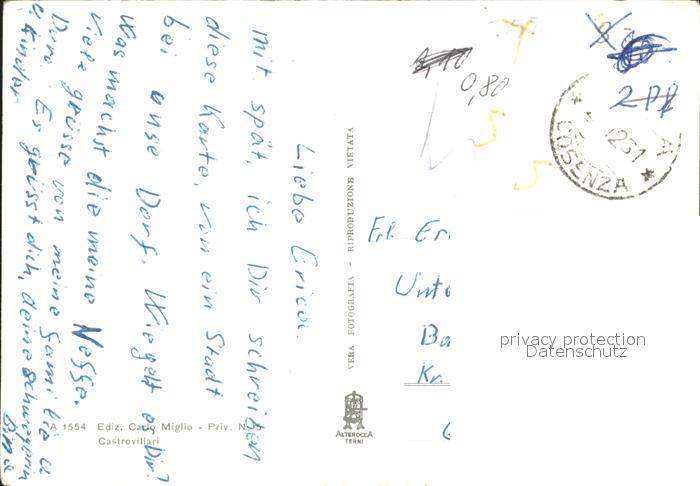 old postcard Castrovillari Corso Garibaldi Madonna Via Roma Ina Casa Campo Sportivo Pollino Panorama postalisch gelaufen Erhaltung siehe scans