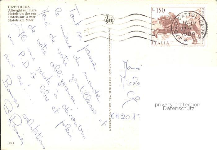 old postcard Cattolica Rimini Alberghi sul mare Hotels am Meer Strand Segelboot postalisch gelaufen