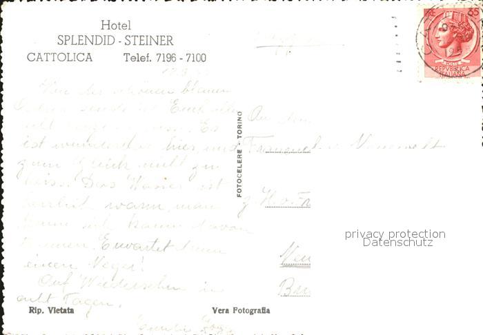 alte Postkarte Cattolica Rimini Hotel Splendid Steiner postalisch gelaufen Erhaltung siehe scans