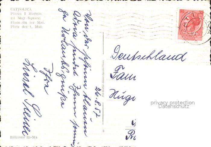 old postcard Cattolica Rimini Piazza I Maggio postalisch gelaufen Erhaltung siehe scans