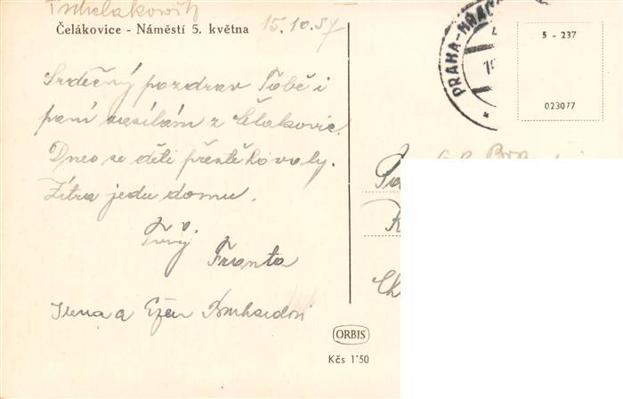 73959427 old postcard Celakovice Czelakowitz CZ Namesti 5. kvetna Platz Stadtzentrum postalisch gelaufen Erhaltung siehe scans [FriedD77] KatCode: 11520