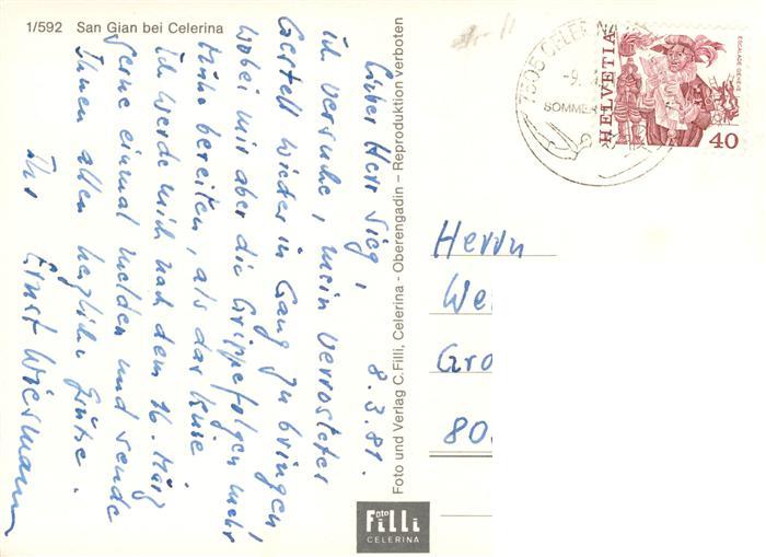 13914689 alte Postkarte Celerina GR San Gian Kirche Pferdeschlittenfahrt postalisch gelaufen Erhaltung siehe scans [WerneD78] KatCode: 11470100335214