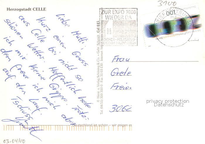 72955840 alte Postkarte Celle Niedersachsen Grosser Plan Brunnen Westcellertorstrasse Rathaus Schloss Pferdeskulptur Stechbahn Hengstparade Franzoesischer Garten Historische Loewenapotheke Fachwerk postalisch gelaufen Erhaltung siehe scans [FriedD77] KatCode: 11110003351006