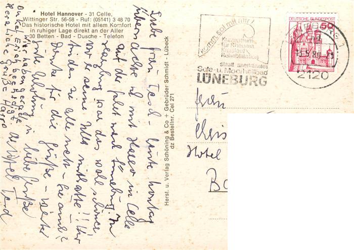 73883516 Celle Niedersachsen Hotel Hannover Gastraum Flur Gartenterrasse postalisch gelaufen Erhaltung siehe scans [WerneD78] alte Postkarte Wern Katcode 11110003351006