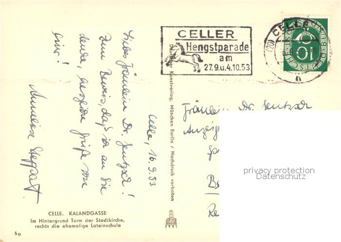 73755394 alte Postkarte Celle Niedersachsen Kalandgasse Turm der Stadtkirche postalisch gelaufen Erhaltung siehe scans [FriedD77] KatCode: 11110003351006