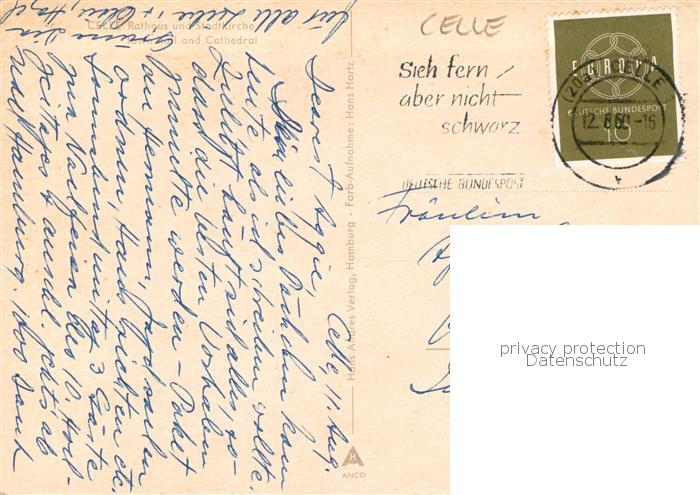 73810387 Celle Niedersachsen Rathaus und Stadtkirche postalisch gelaufen Erhaltung siehe scans [FriedD77] alte Postkarte Frie Katcode 11110003351006