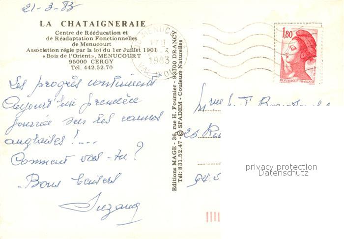 13586302 Cergy La Chataigneraie Centre de Rééducation et de Réadaptation Fonctionnelles de Menucourt postalisch gelaufen Erhaltung siehe scans [FriedD77] carte postale Frie Katcode 11170095395127