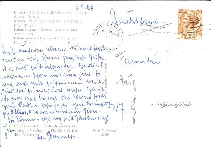 old postcard Ceriale Liguria Camping Albergo Torelli postalisch gelaufen Erhaltung siehe scans