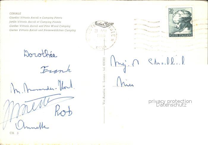 old postcard Ceriale Liguria Garten Vittorio Ascoli Pinienwaeldchen Camping postalisch gelaufen Erhaltung siehe scans