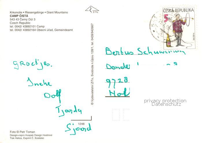 13220422 old postcard Cerny Dul Schwarzenthal Camping Cista postalisch gelaufen Erhaltung siehe scans [LiesaD40] KatCode: 11520