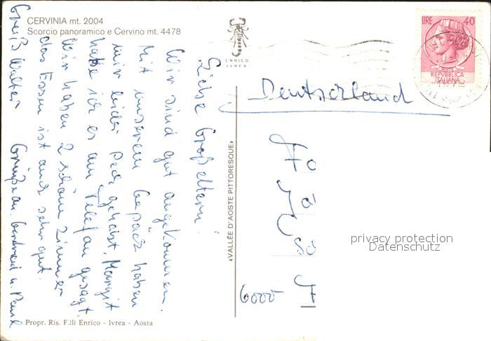 old postcard Cervinia Aosta Scorcio panoramico e Cervino Wintersportplatz Matterhorn Walliser Alpen postalisch gelaufen Erhaltung siehe scans