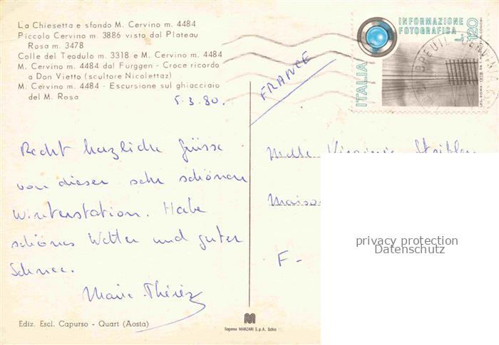 74026899 old postcard Cervinia Breuil-Cervinia Aosta IT La chiesetta Piccolo Cervino Plateau Rosa Don Vietto Escursione sul ghiacciaio del Monte Rosa postalisch gelaufen Erhaltung siehe scans [FriedD77] KatCode: 11240