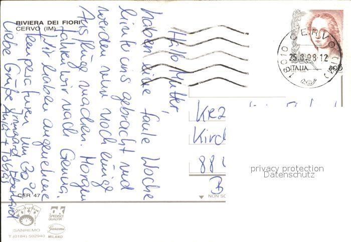 old postcard Cervo Panorama Riviera dei Fiori Spiaggia Strand Altstadt Kirche Nachtaufnahme postalisch gelaufen Erhaltung siehe scans