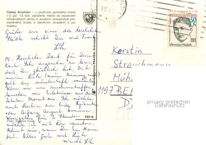 old postcard Cesky Krumlov Stadtpanorama Innenstadt Platz Stadtmauer Kirche postalisch gelaufen Erhaltung siehe scans [FriedD77]