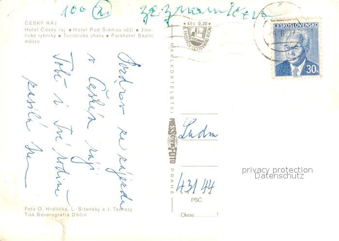 old postcard Cesky Raj Frydstejn Hotel Cesky raj Hotel Pod Sikmou vezi Jinolicke rybniky Turisticka chata Parkhotel Skalni mesto postalisch gelaufen Erhaltung siehe scans [WerneD78]