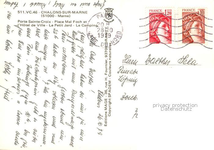 13363716 carte postale Chalons-en-Champagne Marne Porte Sainte Croix Place Mal Foch Hotel de Ville Petit Jard Le Camping postalisch gelaufen Erhaltung siehe scans [FriedD77] KatCode: 11170051151108