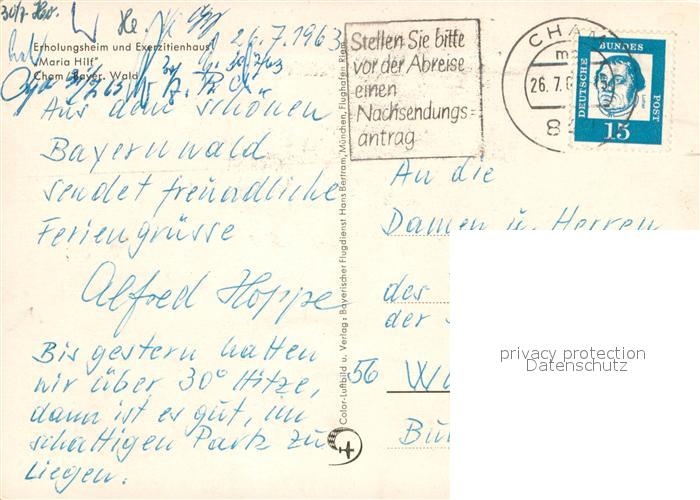 73668931 alte Postkarte Cham Oberpfalz Fliegeraufnahme mit Erholungsheim und Exerzitienhaus Maria Hilf postalisch gelaufen Erhaltung siehe scans [WerneD78] KatCode: 11110009372116