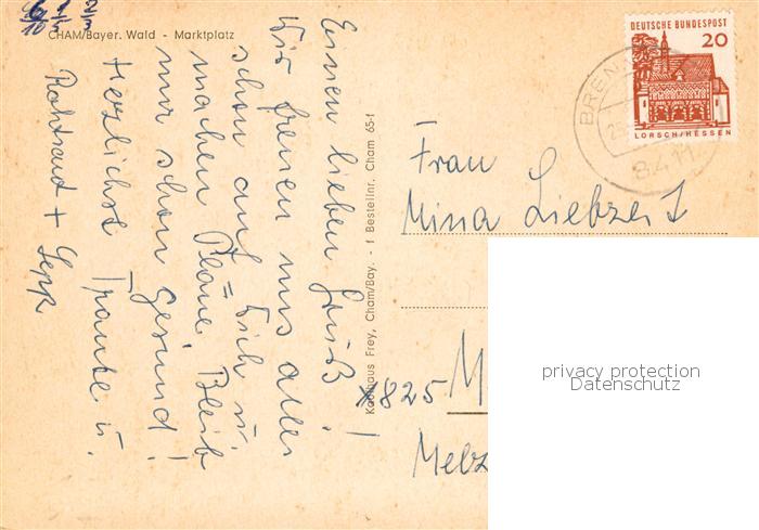 73867005 alte Postkarte Cham Oberpfalz Marktplatz postalisch gelaufen Erhaltung siehe scans [WerneD78] KatCode: 11110009372116