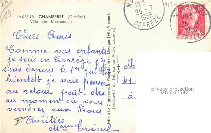 14104727 carte postale Chamberet TULLE 19 Correze Villa des Marronniers postalisch gelaufen Erhaltung siehe scans [FriedD77] KatCode: 11170019219036