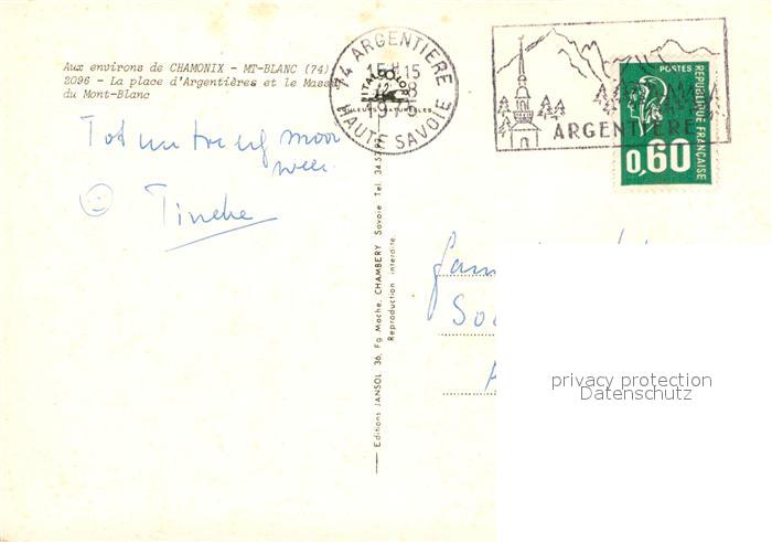12941796 carte postale Chamonix La place d’Argentiniere et le Massif de Mont Blanc postalisch gelaufen Erhaltung siehe scans [WerneD78] KatCode: 11170074274056