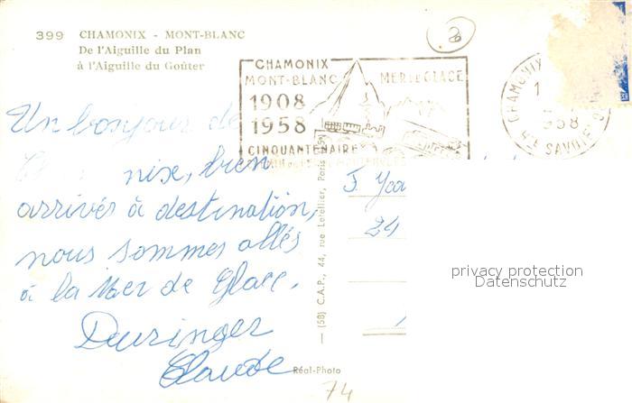 13487825 carte postale Chamonix Panorama Aiguille du Plan et du Goûter Alpes Francaises postalisch gelaufen Erhaltung siehe scans [FriedD77] KatCode: 11170074274056