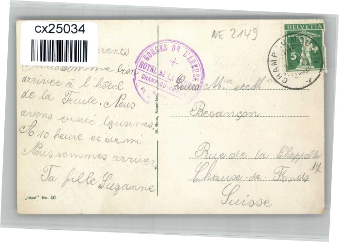 10753266 alte Postkarte Champ-du-Moulin Hotel Truite postalisch gelaufen KatCode: 11470130405066