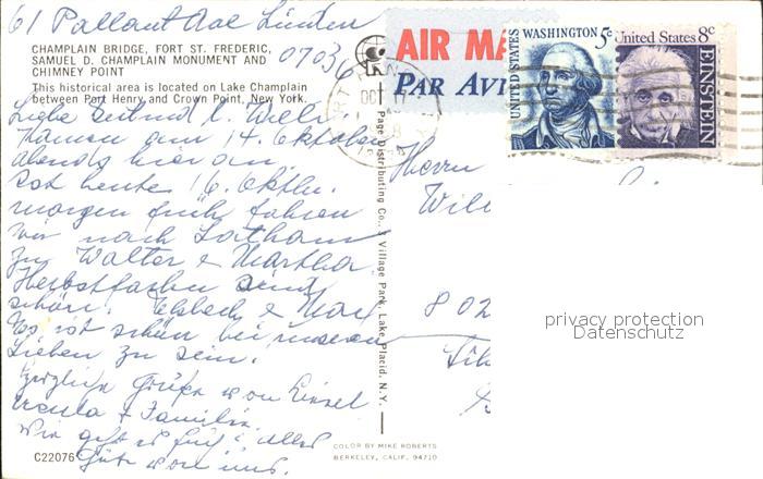 72366579 old postcard Champlain New York Champlain Bridge Fort St. Frederic Samuel D. Champlain Monument postalisch gelaufen Erhaltung siehe scans KatCode: 14140340000000