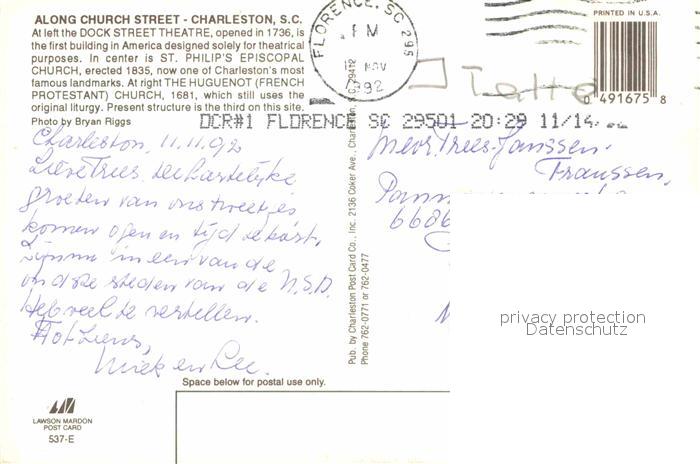 72865193 old postcard Charleston South Carolina Along Church Street Dock Street Theatre St Philips Episcopal Church Huguenot Church postalisch gelaufen Erhaltung siehe scans [FriedD77] KatCode: 14140430000000